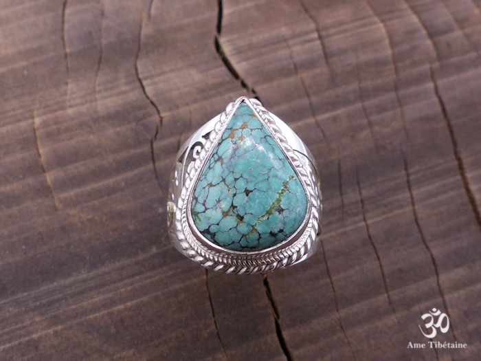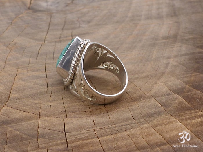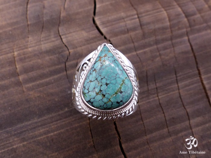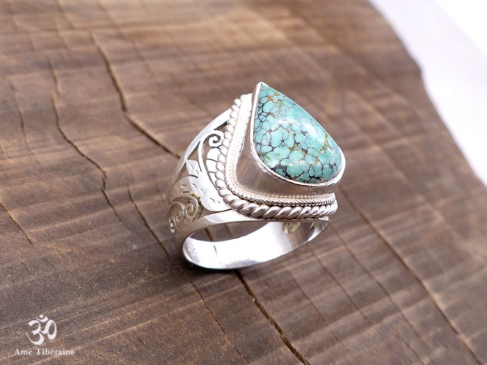 Belle bague tibétaine en argent massif, ornée de turquoise.