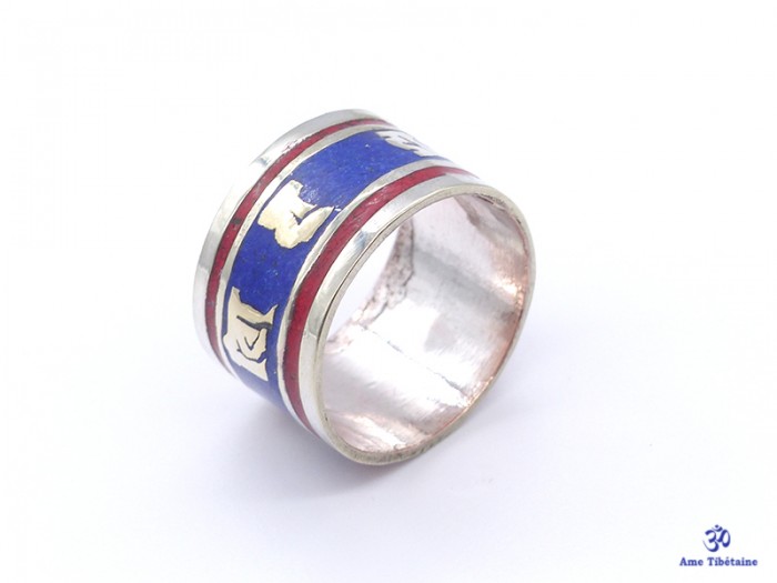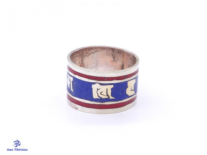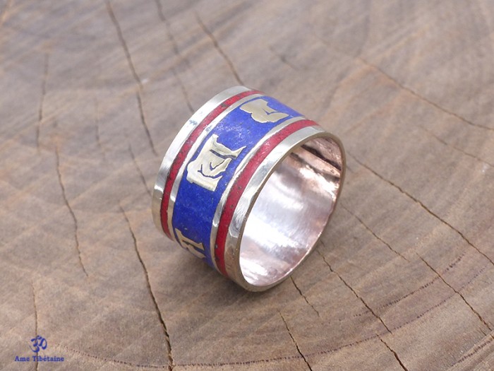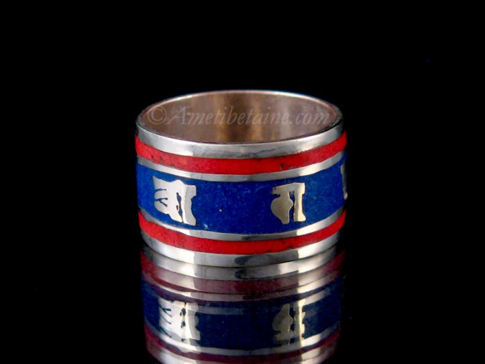 Jolie bague tibétaine en métal, avec le mantra Om Mani Padme Hum.