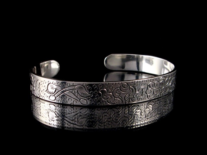 Magnifique bracelet tibétain, en argent massif, avec les huit signes auspicieux du bouddhisme.
