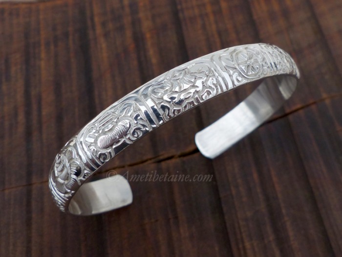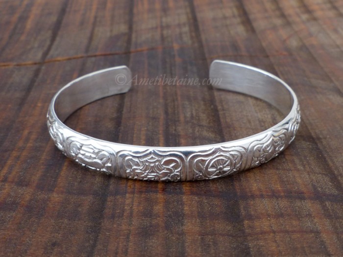 Magnifique bracelet tibétain, en argent massif rhodié, avec les huit signes auspicieux du bouddhisme.