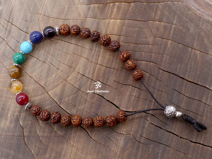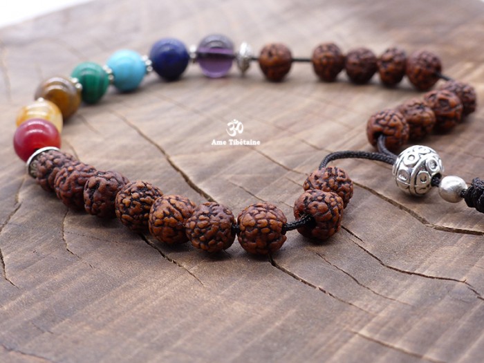 Bracelet mala tibétain avec des perles de rudraksha, et 7 perles différentes qui représentent les 7 chakras.