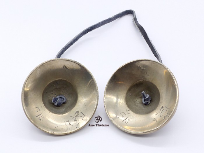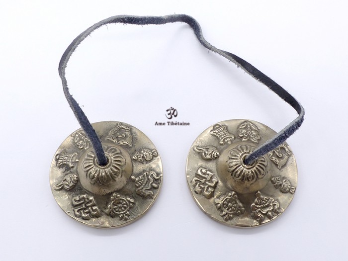 Cymbales tibétaines, ou tingshas, en laiton, faites au Népal par des artisans tibétains, avec les huit signes auspicieux du bouddhisme, ou astamangala.
