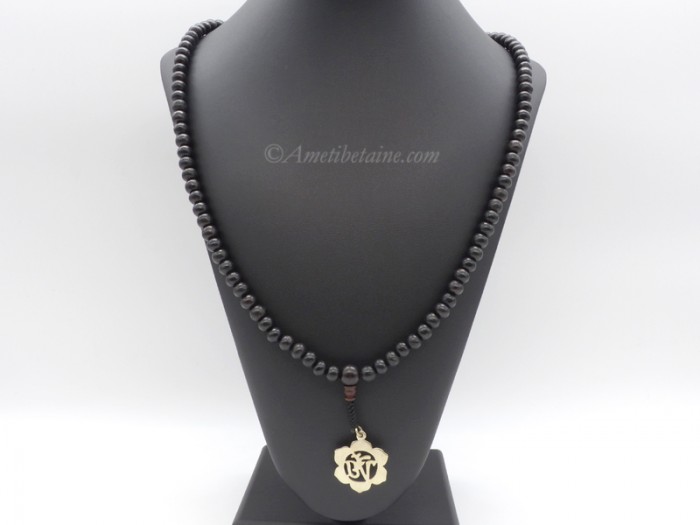 Beau mala de prières tibétain, fait avec des perles en bois, et un symbole Om.