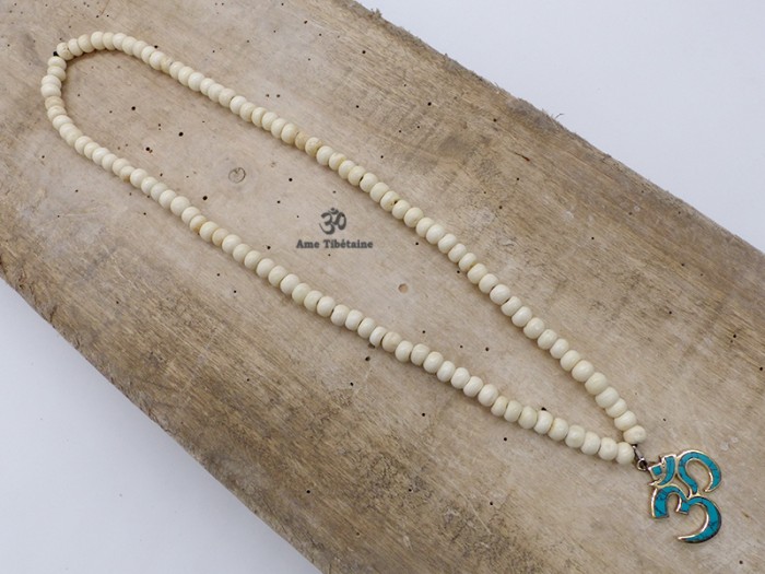 Beau mala de prières tibétain, fait avec des perles en os de buffle, et le symbole Om.