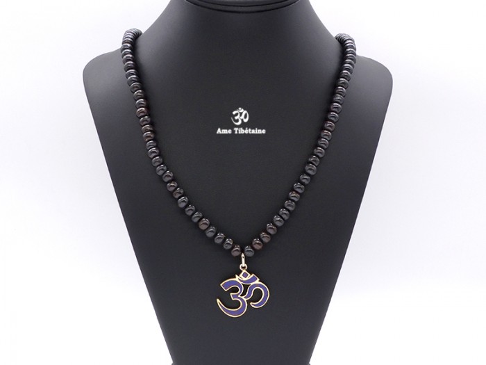 Beau mala de prières tibétain, fait avec des perles en os de buffle, et le symbole Om.