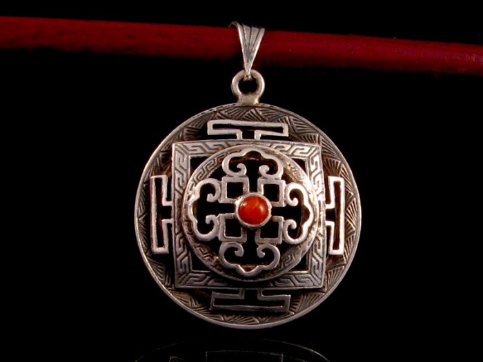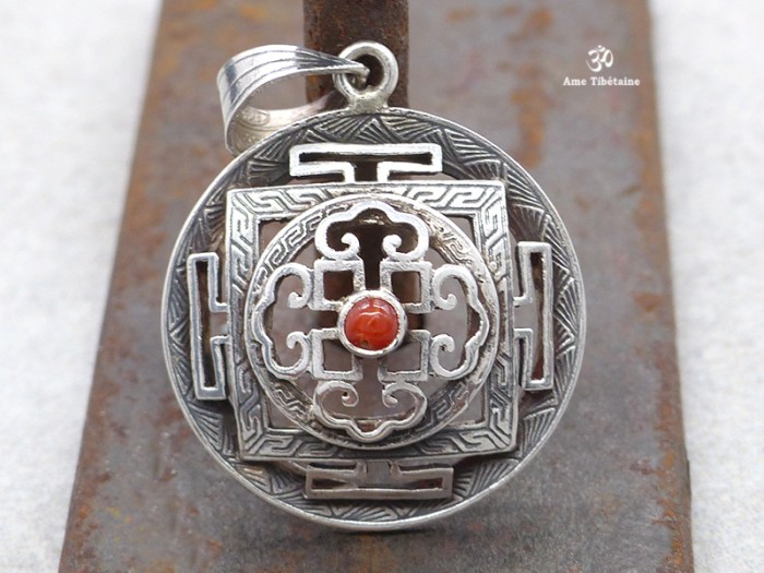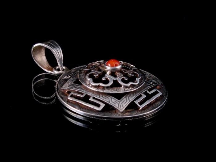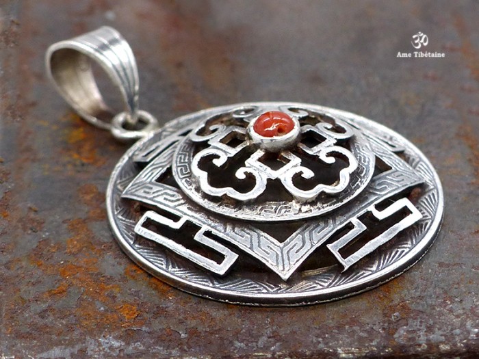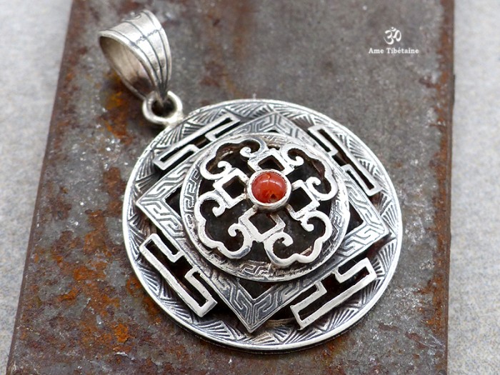 Pendentif en argent massif, en forme de mandala, avec du corail.